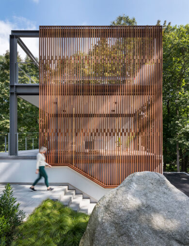 A modern steel and glass staircase rises from the attic to the rooftop against a backdrop of exposed brick. The stairs lead to a modern pavilion that provides access to the rooftop lounging space. The roof deck is built from mahogany, which will develop a silvery patina as the wood ages. The mahogany elements include built-in seating, which is settled against a wood slat railing that provides a sense of security and maintains intimacy. Additionally, a perimeter trellis frames the gorgeous views of the tree-lined hills to the west of Brookline.