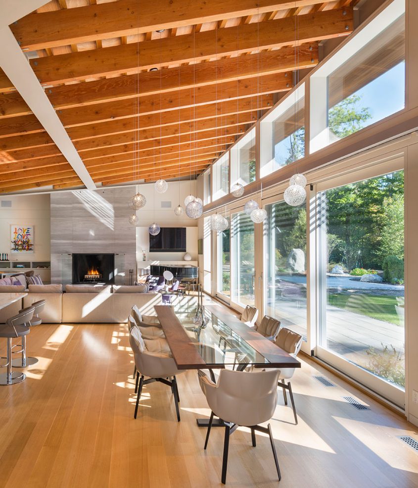 It was just what the couple had in mind—without quite knowing it. “All we knew was that we wanted the inside to come out and the outside to come in,” says the owner. And it does: Most of the backside of the house is floor-to-ceiling glass. The great room has 9-foot-tall sliding glass doors that look out over the expansive backyard and gardens. The four-season sun porch’s stacking glass doors open to a patio, pool, and hot tub. “The sunlight pouring in provides tremendous soul energy,” says the owner."HEART & SOL: A MODERN MANSION IN LENOX," BOSTON HOME, 2017