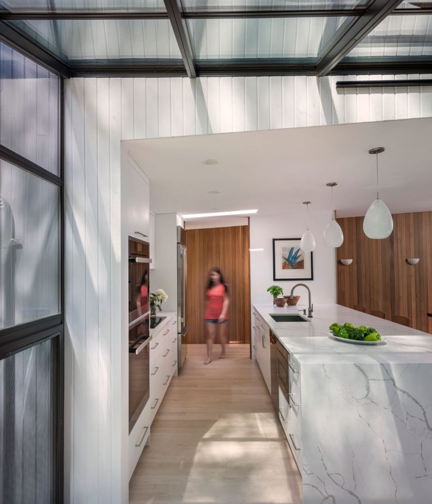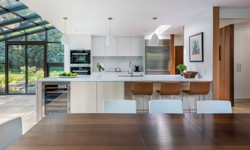 After living in the house for 65 years, the family sold the house to our client, who asked us to design a renovation that would respect the integrity of the vintage modern architecture. Our design focused on reorienting the kitchen, opening it up to the family room. The bedroom wing was redesigned to create a principal bedroom with en-suite bathroom. Interior finishes were edited to create a more fluid relationship between the original TAC home and Hoover’s addition. We worked closely with the builder, Patriot Custom Homes, to install Solar electric panels married to an efficient heat pump heating and cooling system. These updates integrate modern touches and high efficiency into a striking piece of architectural history.