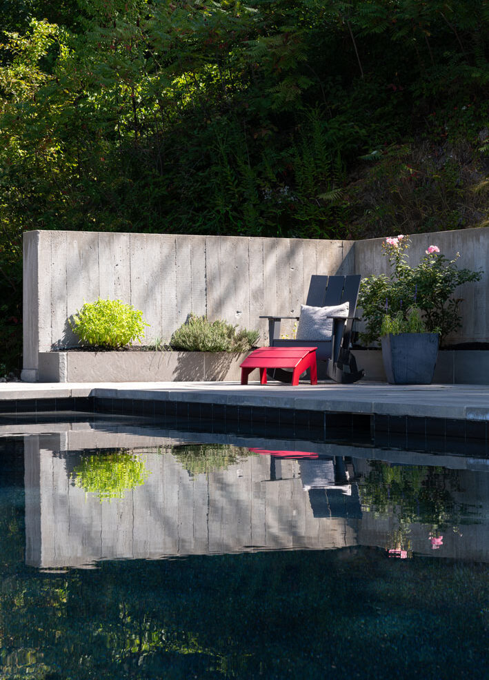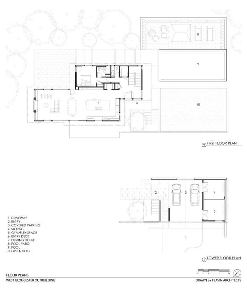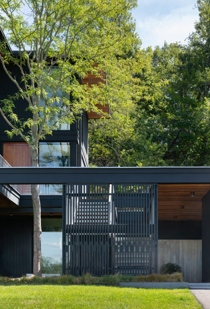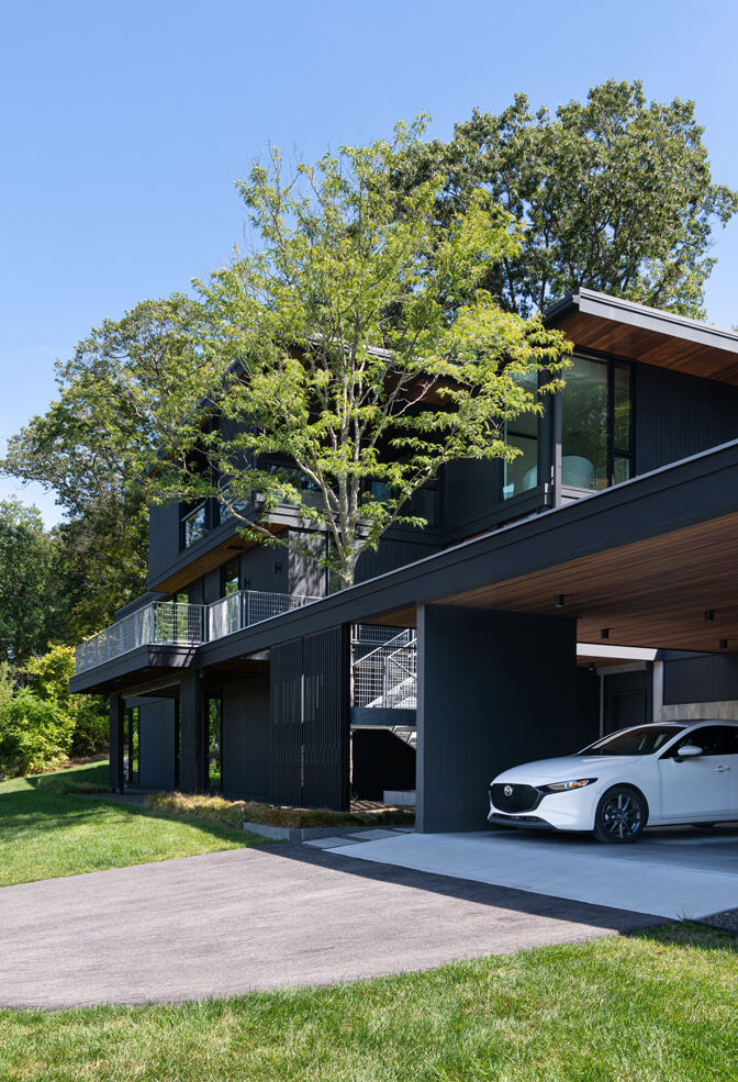 We designed West Gloucester House for our clients on a steep site overlooking the Annisquam River on Cape Ann, MA. After spending more time in the home, our client asked us to execute a master plan for the property, rethinking the entry sequence to the home, adding a pool, outdoor gathering space, workout room, and additional storage. The multi-use carport space now allows for two covered parking spots and doubles as a ping pong court. The structure also creates privacy for the new outdoor pool area, blocking views from the road.