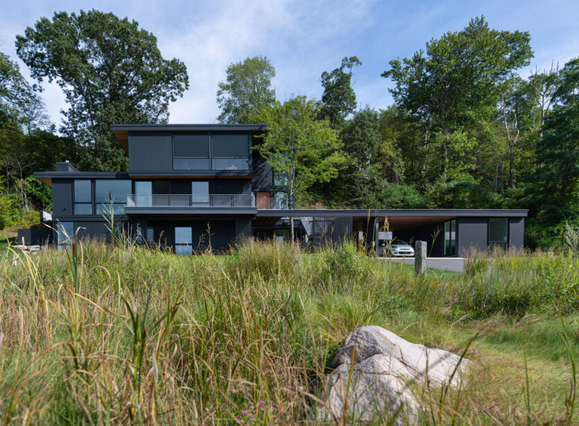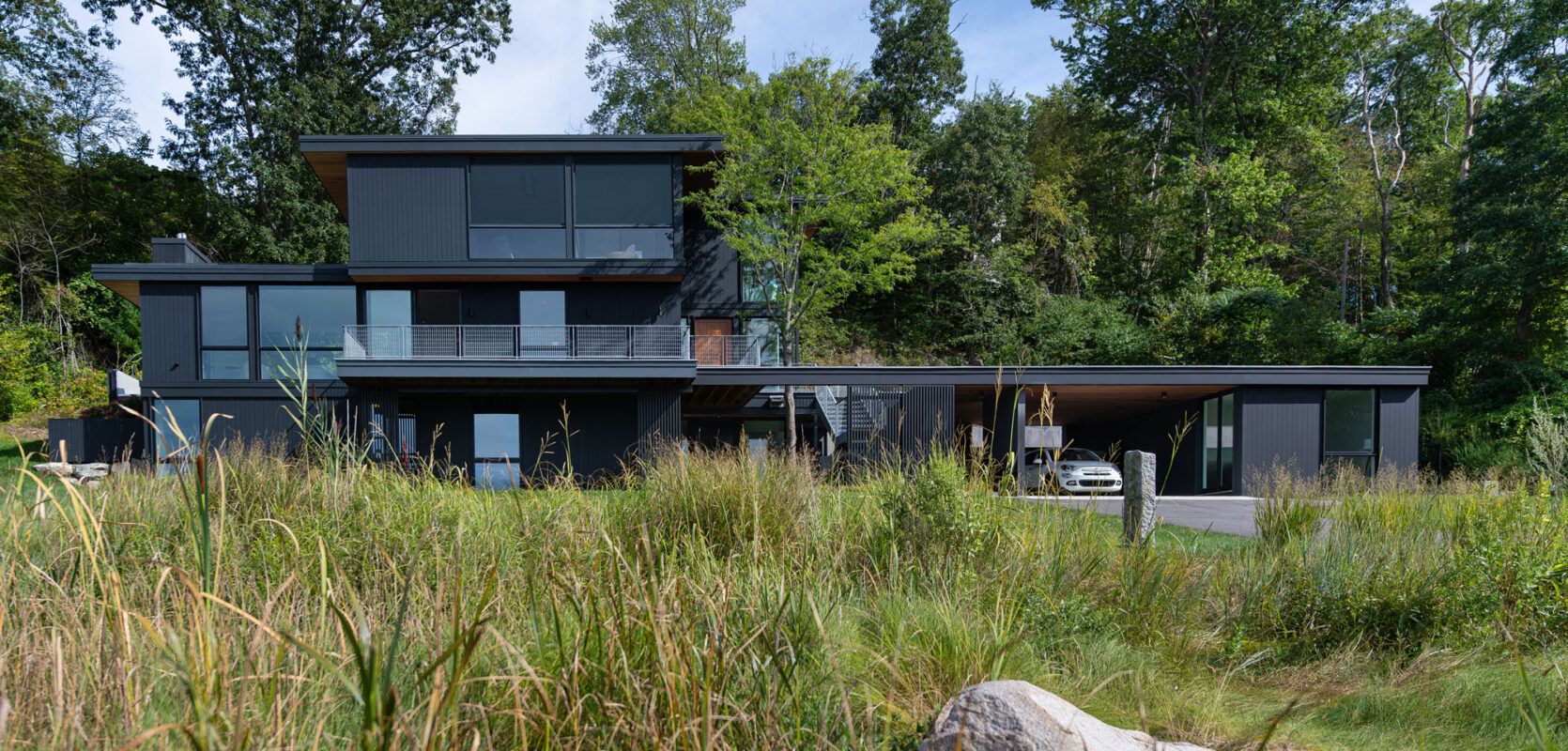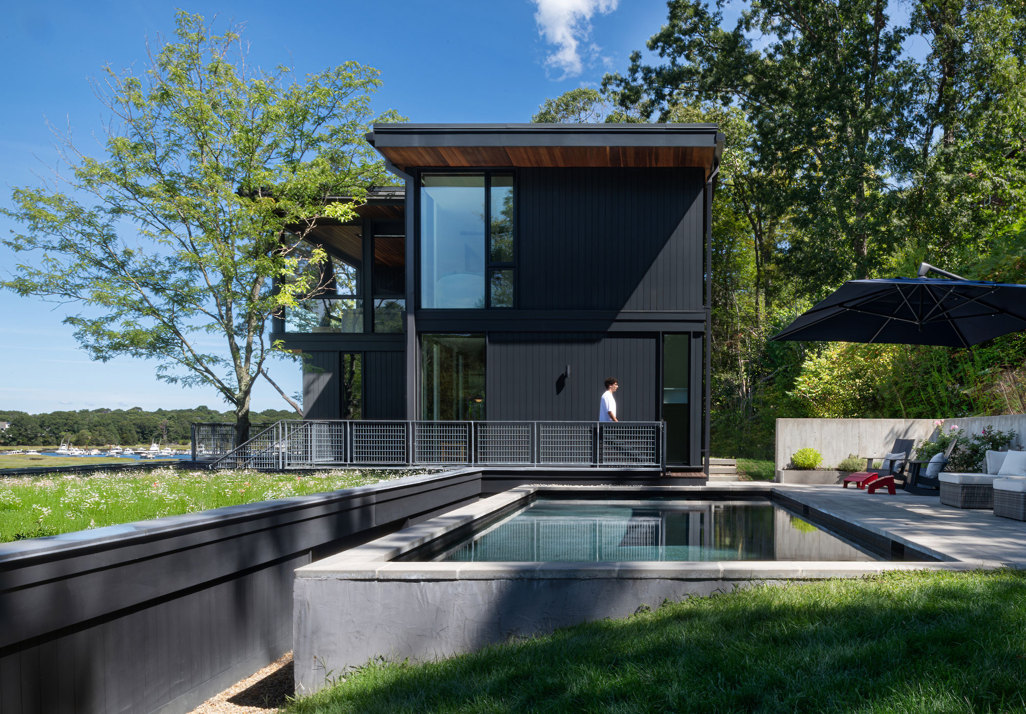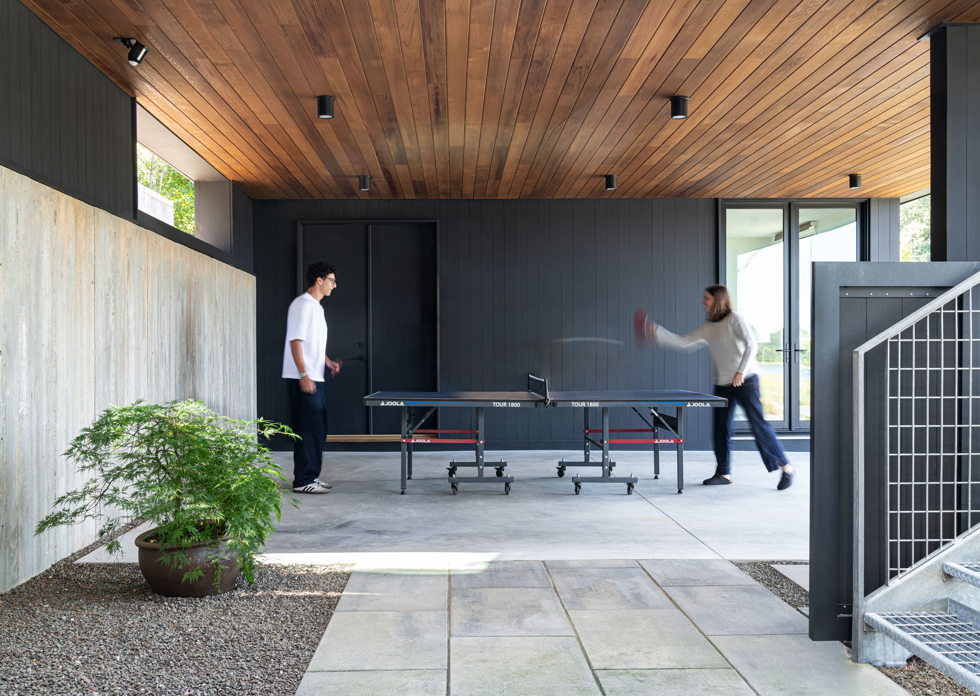 We designed West Gloucester House for our clients on a steep site overlooking the Annisquam River on Cape Ann, MA. After spending more time in the home, our client asked us to execute a master plan for the property, rethinking the entry sequence to the home, adding a pool, outdoor gathering space, workout room, and additional storage. The multi-use carport space now allows for two covered parking spots and doubles as a ping pong court. The structure also creates privacy for the new outdoor pool area, blocking views from the road.