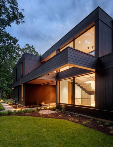 The house sits at the center of a sloped, wooded property, buffered from the adjacent suburban road by tall pines. A winding driveway ascends to reach a strikingly modern residence, tucked into its natural setting. A plinth of board-form concrete supports the main floor, its surface echoing the natural textures of the surrounding woodlands. Mindful of the road below, the north face embraces privacy and opacity, interrupted by a few thoughtfully placed windows. Carefully detailed mahogany screens and vertical battens add further texture to the exterior, while a dramatic canopy provides cover and directs the eye to the main entry, placed at the hinge-point of the home’s two wings.