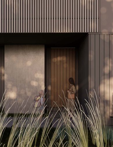 The design intent moves visitors into the home through three bays that transition from open air to fully enclosed. A glazed, light box acts as the transition space between the garage and entry on the left. An armature that is partly filled in, it defines the outdoor space. Large sliding doors in the middle bay beckon you indoors. The final bay hosts large windows but no direct exit, making it the most private.