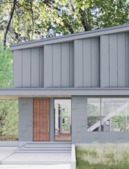 The design intent moves visitors into the home through three bays that transition from open air to fully enclosed. A glazed, light box acts as the transition space between the garage and entry on the left. An armature that is partly filled in, it defines the outdoor space. Large sliding doors in the middle bay beckon you indoors. The final bay hosts large windows but no direct exit, making it the most private.